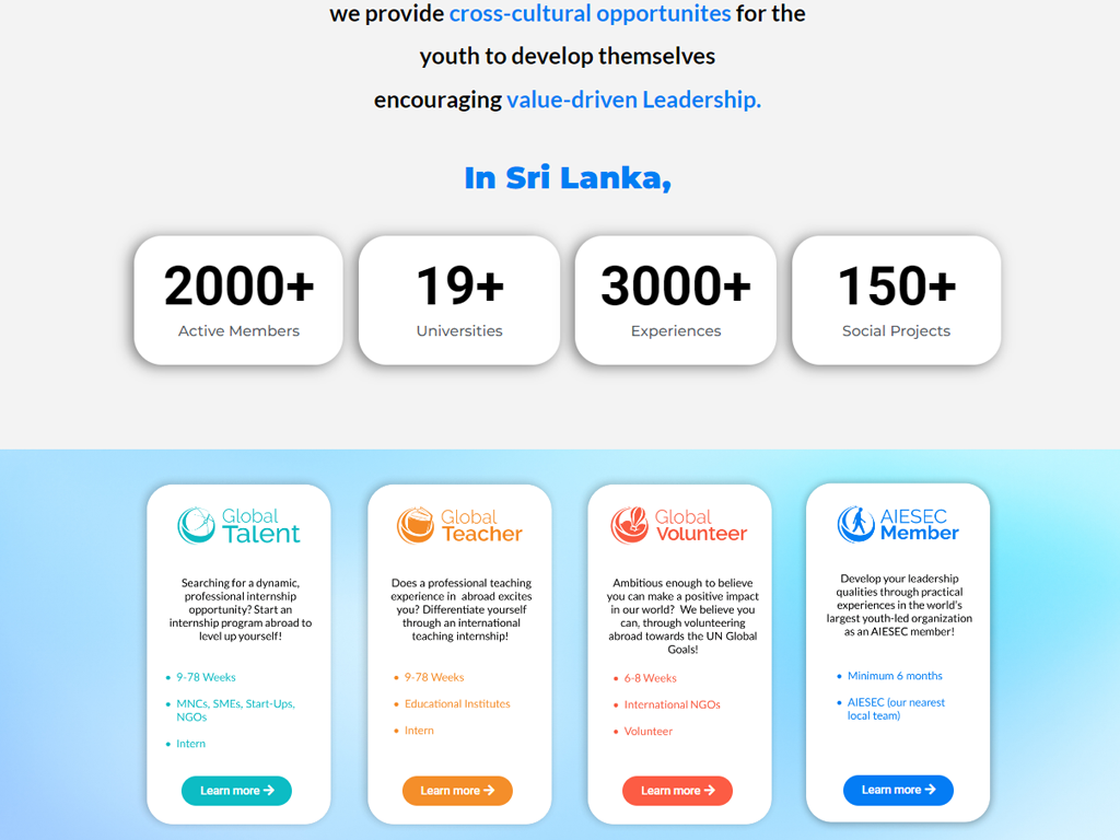 AIESEC in Sri Lanka’s website is designed for seamless exploration of global opportunities. With a focus on user-friendly navigation and vibrant visuals, it captures the spirit of adventure and growth. Each element inspires young leaders to discover internships, volunteer projects, and cultural exchanges, making it easy to start their journey with AIESEC.